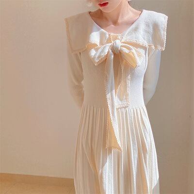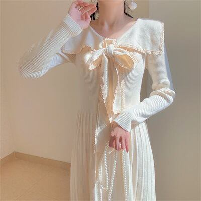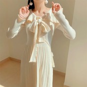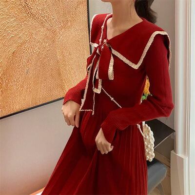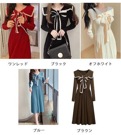 ニットワンピース ロングワンピース リボンスカート ロングニットワンピース ひざ丈 Aライン レディース 膝丈 着痩せ 秋冬 ウエスト引き締め バイカラー プリーツスカート ドレス 結婚式 通勤 OL | koookooo