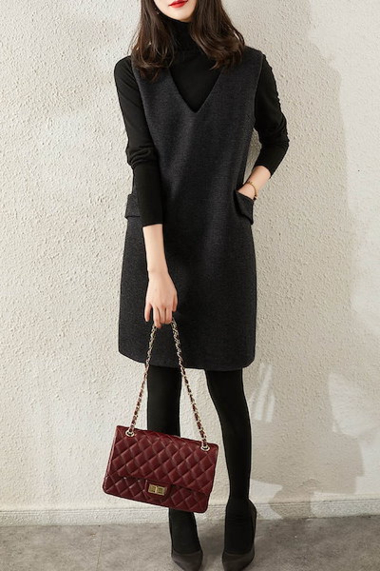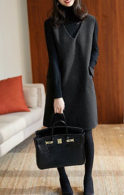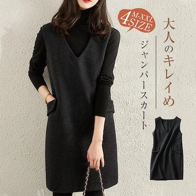 ワイドパンツ レディース ボトムス スジャンパースカート Vネック ジャンスカ ワンピース ジャンスカ ワンピ レディース ポケット付き ミセス 重ね着 ひざ丈 秋 冬 ゆったり きれいめ | koookooo