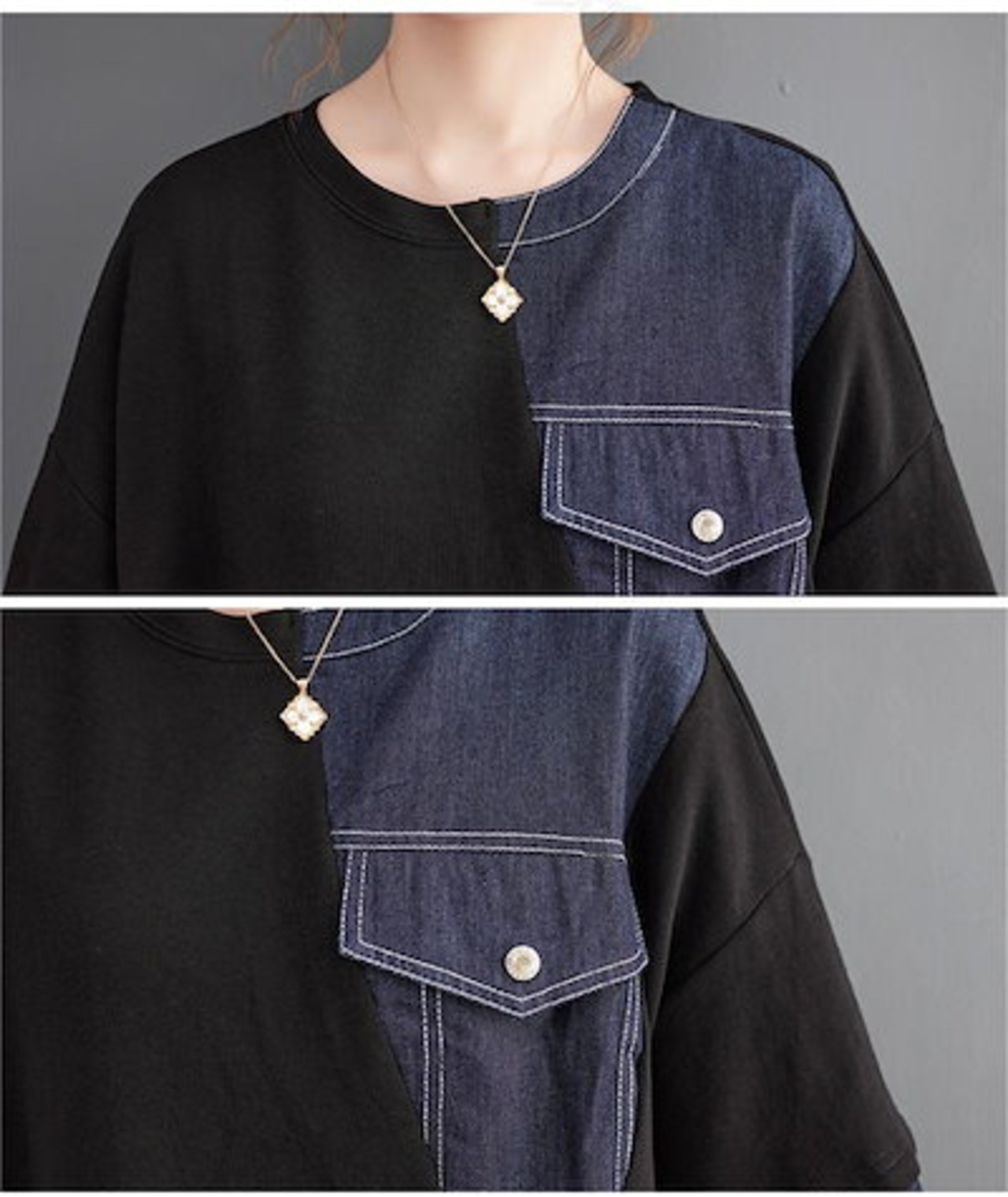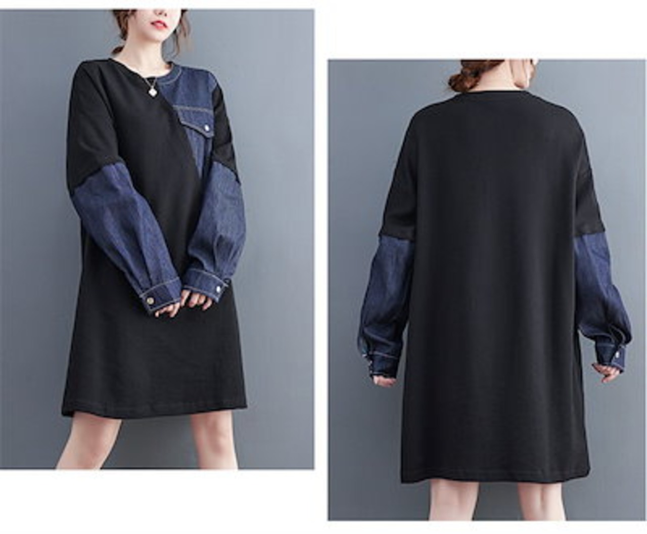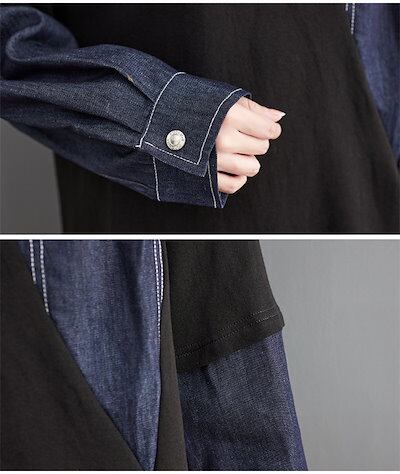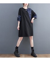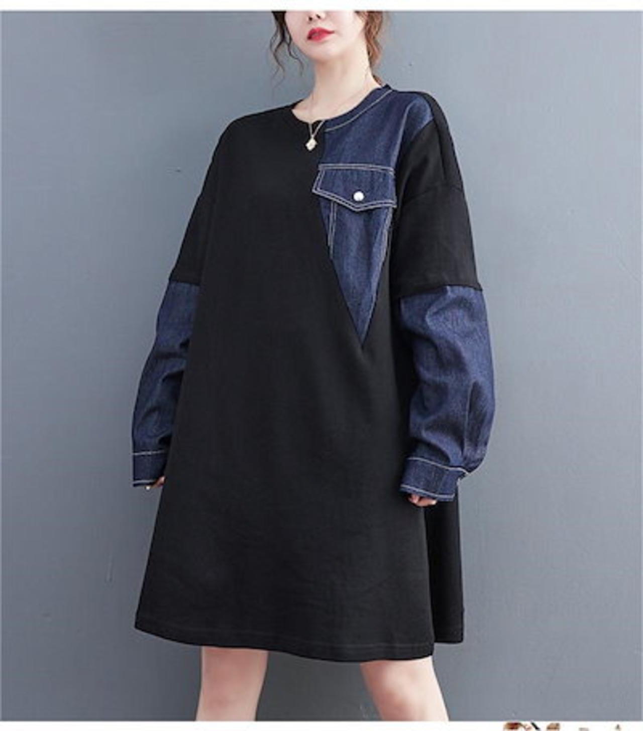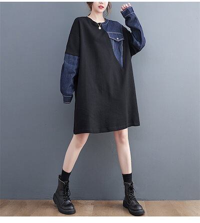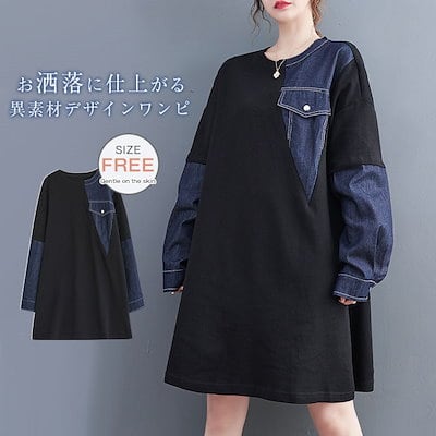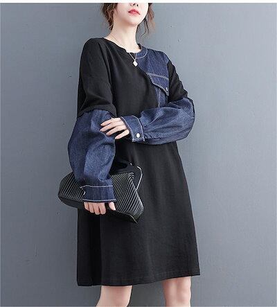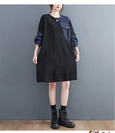 異素材チュニック ワンピース レディース 長袖 チュニックワンピース 大きいサイズ デニム トップス プルオーバー 大人可愛い ゆったり 膝丈 体型カバー 森ガール ワンピ レトロ ひざ丈 春 秋 冬 | koookooo