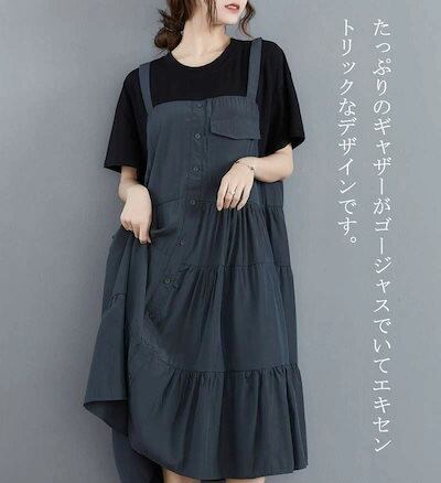 ドッキングワンピース レディース 夏 ワンピース 丸首 半袖 レイヤード ワンピ 異素材 タック ボタン フラップポケット ロングワンピース ミモレ丈 Aライン 切り替え フレアワンピ 体型カバー ゆ | koookooo