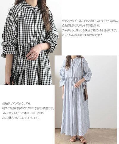 ワンピース 長袖 レディース 春 秋 ストライプ チェック柄 大きいサイズ ロングフレアシャツワンピース ロング丈 長そで ロングワンピ バンドカラー シャツワンピ ボタン留め ブラック 格子 きれい | koookooo