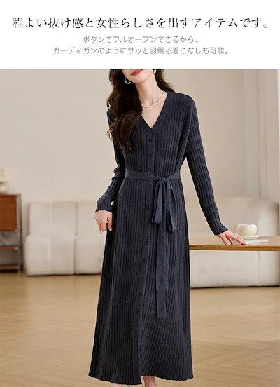 ニット ワンピース レディース 秋 冬 長袖 Vネック リブニットワンピース ロングワンピース 羽織り 前開き ボタン付き 伸縮性 お洒落 女性 ゆったり おしゃれ きれいめ カジュアル 上品 無地 | koookooo