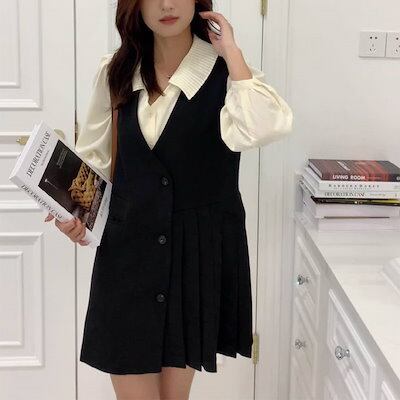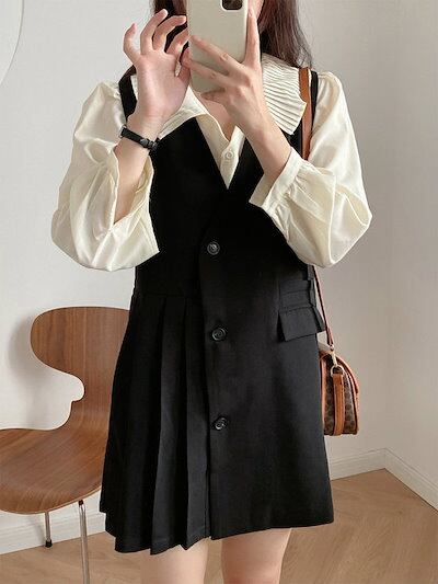 レディース ノースリーブ ワンピース ミニ丈 プリーツ Vネック 水牛プラスティックボタン トレンチ風 セットオンポケット 無地 秋冬 カジュアル 大人可愛い エレガント フェミニン オフィス OL | koookooo