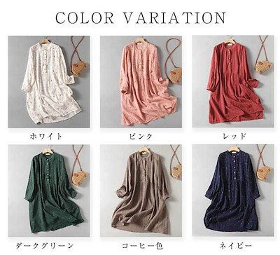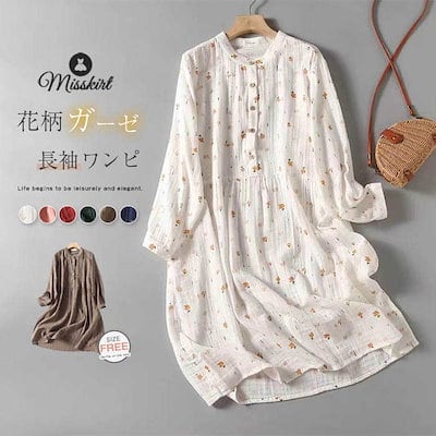 予約受付中ワンピース シャツワンピース 新作 花柄 ガーゼ 綿 長袖 春 秋 プルオーバー 立ち襟 レディース ロング ワンピ プリント 体型カバー ゆったり デザイン感 レトロ ボタン 着痩せ エレ | koookooo
