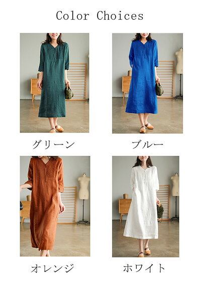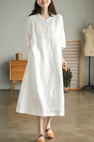 新品 ワンピース ピンタック 麻 レディース ロングワンピース 夏 春 五分袖 Vネック ボタン リネン ワンピ ミモレ丈 Aライン ゆったり おしゃれ ミモレ丈ワンピース キレイめ シャツワンピース | koookooo