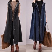 2色 ワンピース アウター ベスト ロングベスト レディース ロング丈 秋 冬 ブラック 黒 ブルー 青 フリーサイズ ワンサイズノースリーブ フード付き ボタン シングルブレスト デニム カジュアル | koookooo