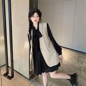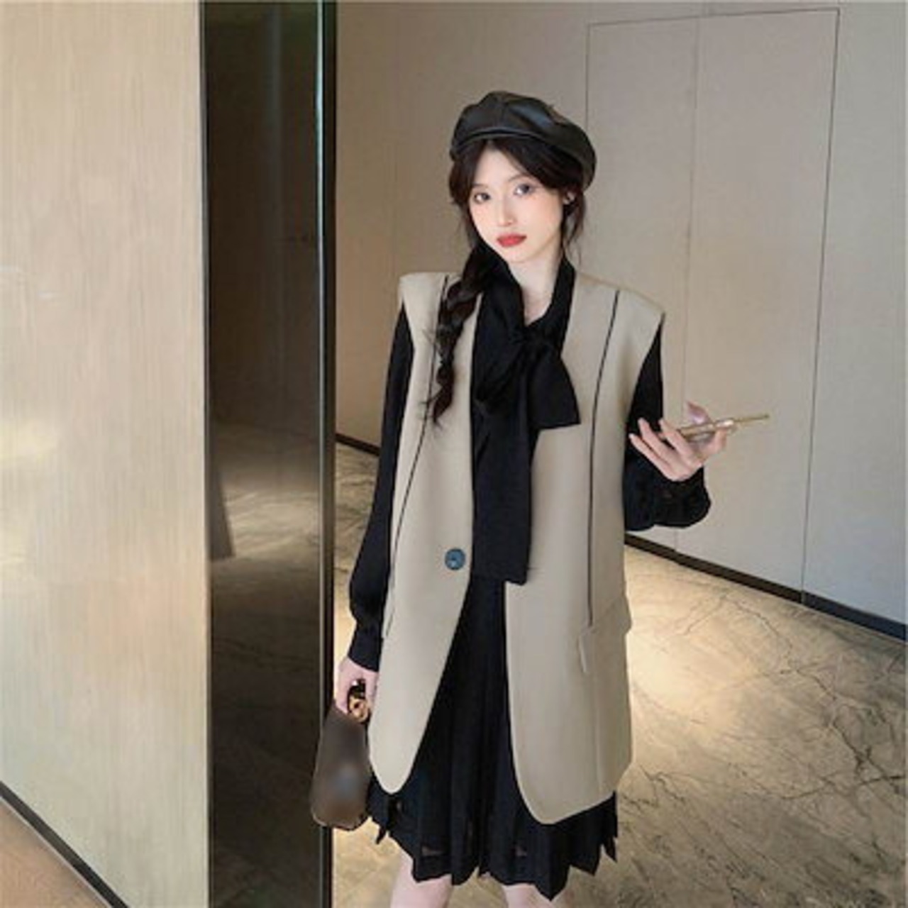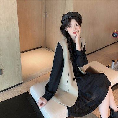 セットアップ ワンピース ベスト レディース 2点セット ミニワンピース ボウタイ 黒 大人可愛い きれいめ カジュアル ツーピース 春 秋 ブラック 黒 ホワイト 白 襟付き ボタン シングルブレス | koookooo