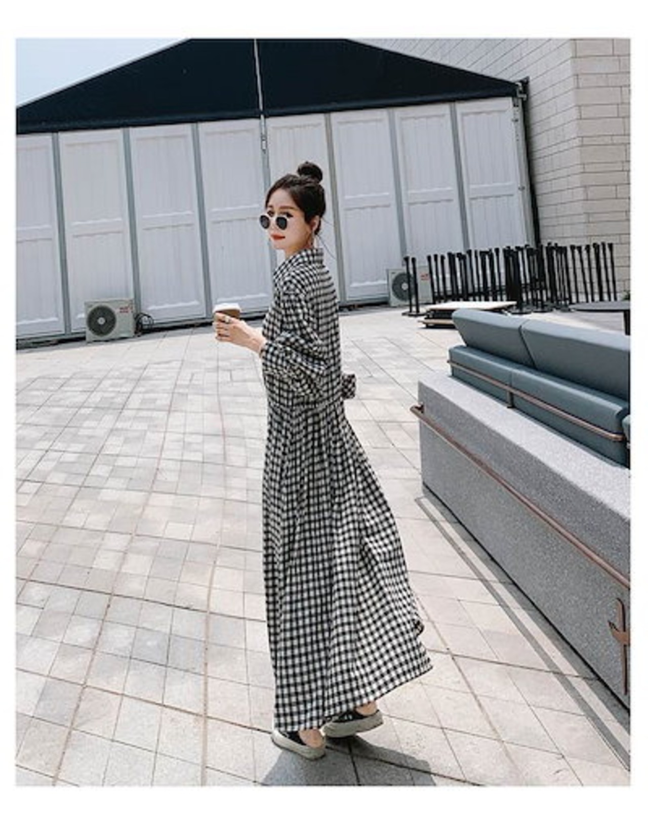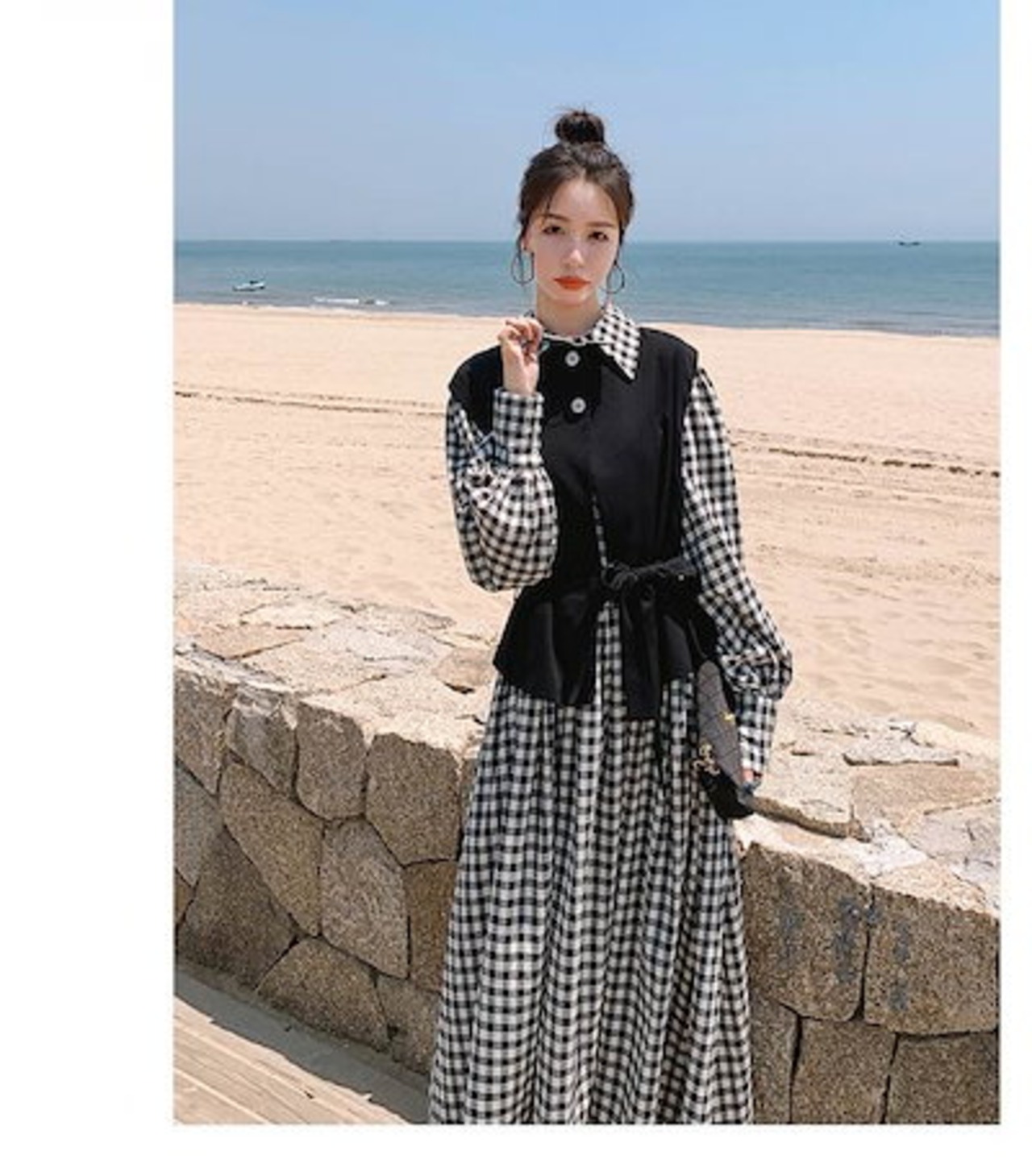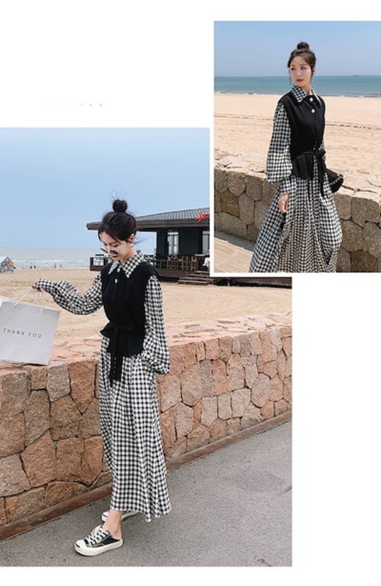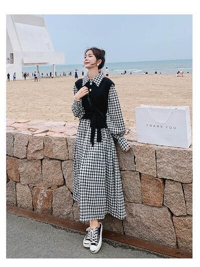 セットアップ ワンピース ベスト レディース ギンガムチェック 黒 大人可愛い きれいめ カジュアル ツーピース ロング丈 マキシ丈 春 秋 チェック柄 ブラック 黒 ホワイト 白 襟付き ボタン シ | koookooo