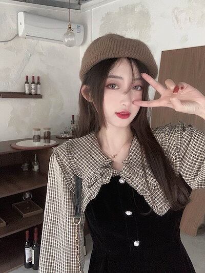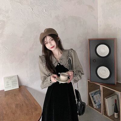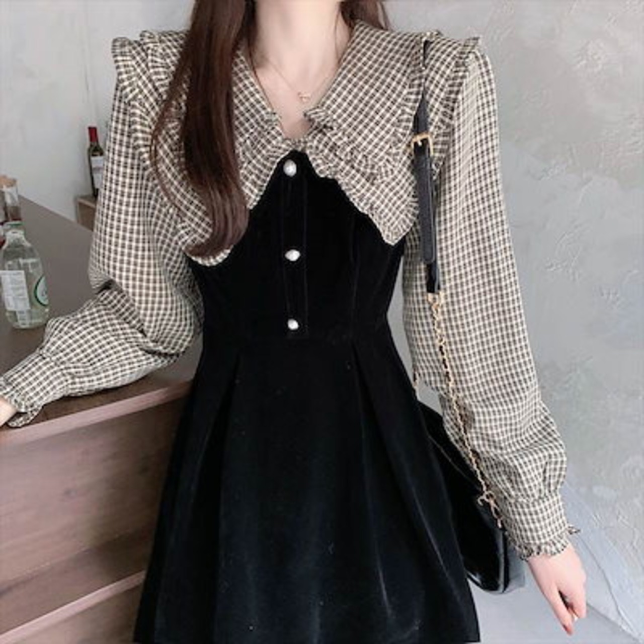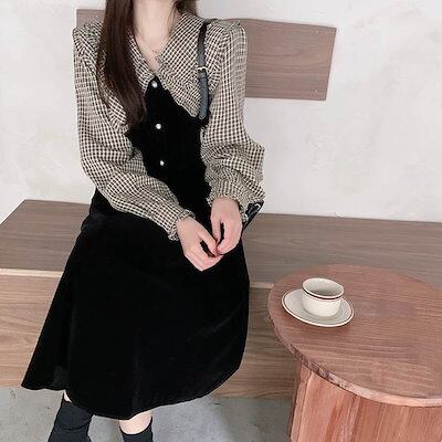 ワンピース レディース フェイク ツーピース ロング丈 Aライン 長袖 大人可愛い かっこいい 襟付き 黒 ブラック 無地 チェック フリル ボタン セレブ感 きれいめ 大人 レトロ 大人可愛い ラブ | koookooo