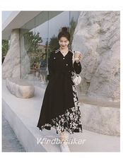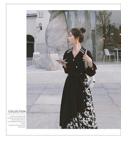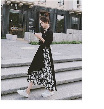 ワンピース レディース ロング丈 マキシ丈 秋 ブラック 黒 花柄 無地 プリント 長袖 Vネック 襟付き ボタン シングルブレスト ウエストリボン Aライン カジュアル レトロ 大人可愛い おしゃれ | koookooo