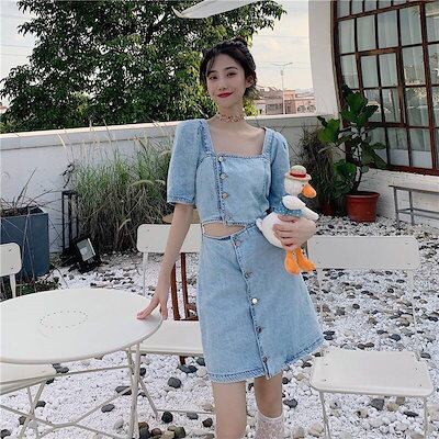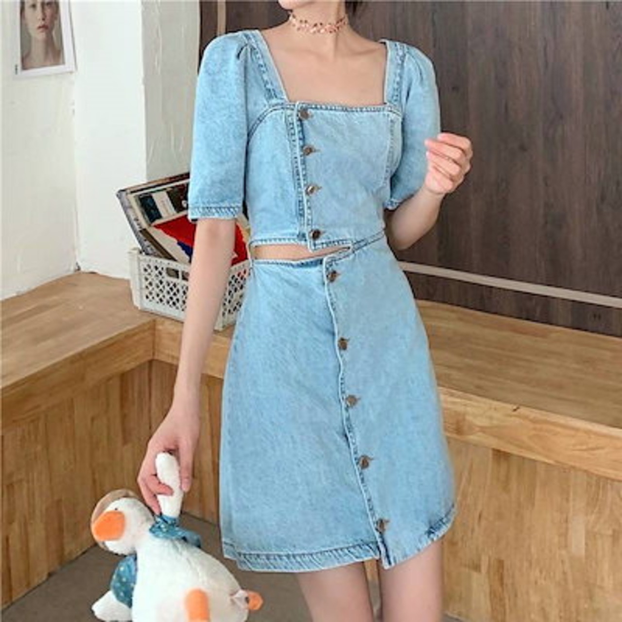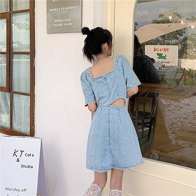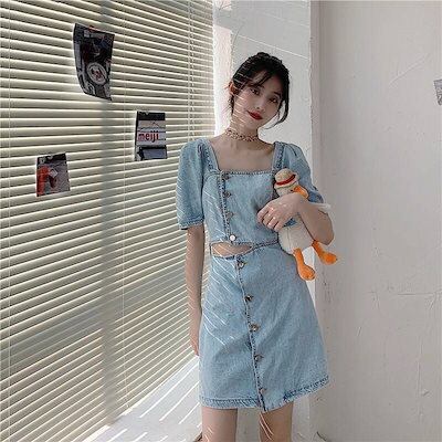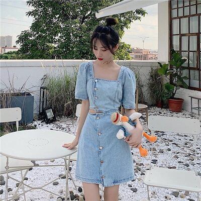 ワンピース レディース デニムワンピース 穴あき ミニ丈 ミニワンピ ミディアム丈 デニムスカート ラップスカート おしゃれ 大人可愛い 半袖 個性的 五分袖 ガーリー スクエアネック ボタン 襟なし | koookooo