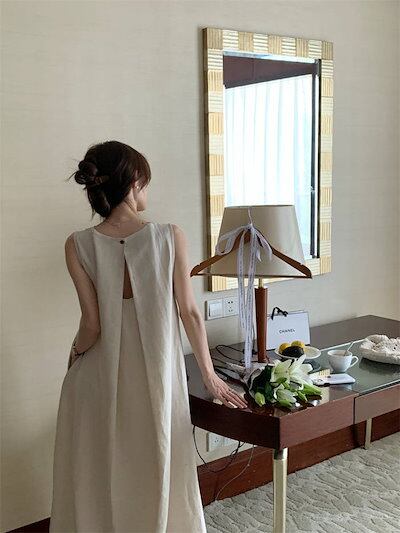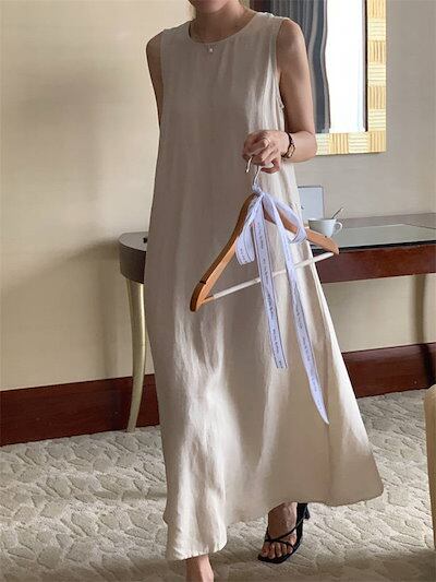 ワンピース レディース ノースリーブ 春 夏 リネン 春夏 ロングワンピース レディースワンピ ノースリーブワンピース ロング ロング丈 ロングワンピ 無地 クルーネック バックボタン Aライン レイ | koookooo