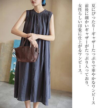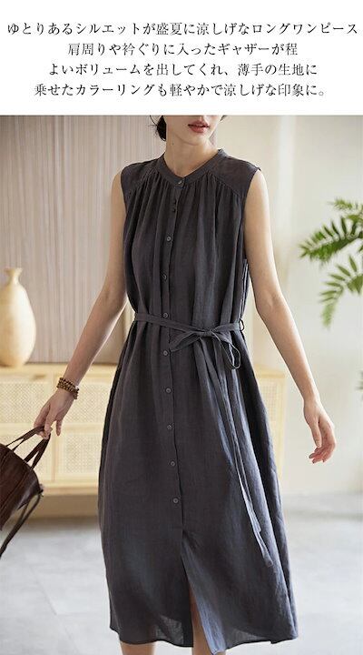 ギャザーシャツワンピース レディース 夏 ノースリーブワンピース シャツワンピース ロングワンピース 綿麻 羽織り 前開き ボタン リボン付き 大きいサイズ シンプル おしゃれ 大人 可愛い 通勤 カ | koookooo