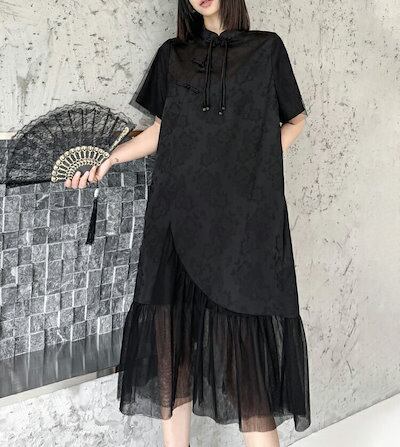 チュールデザイン ワンピース レディース きれいめ チャイナボタン ロングワンピ 半袖 襟付き アシンメトリー 服 着痩せ 韓国 春 夏 黒 変形デザイン 個性的 モード 切り替え ドッキング メンズ | koookooo