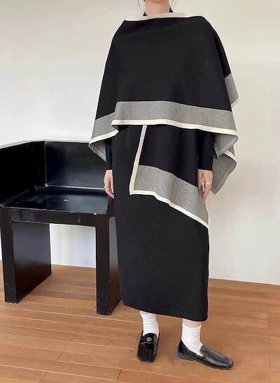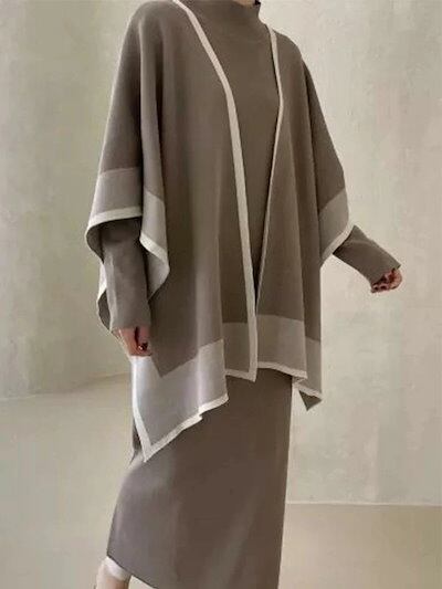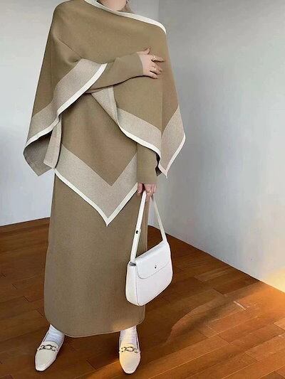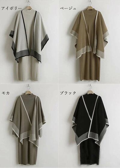 2025新作 韓国風ニットセットアップ ニットワンピース レディース ワンピース ロングワンピース フレアーワンピース フレアー 2点セット 秋 冬 ケープ ロング 膝下 長袖 ハイネック 無地 カジ | koookooo