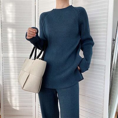 2025新作 韓国風セットアップ ニット レディース ワイドパンツ 秋冬 きれいめ 上下セット パンツセット ニットセーター プルオーバー リブニット ワイド 長袖 厚手 プチハイネック 柔らか ゆっ | koookooo