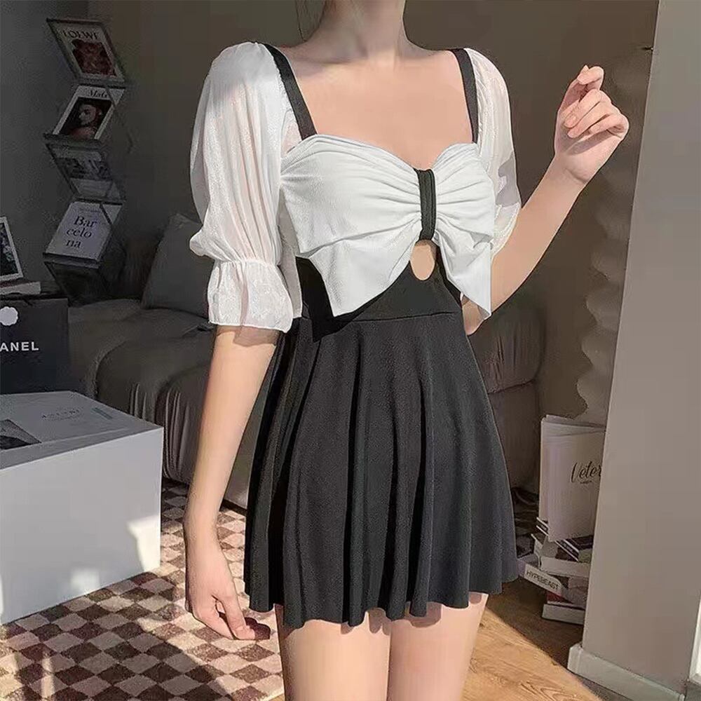 水着 体型カバー リボン ワンピース水着レディース 水着セット ビーチファッション 韓国風セクシー水着 シースルー袖 スイムウエア プール遊び 海水浴場リゾート