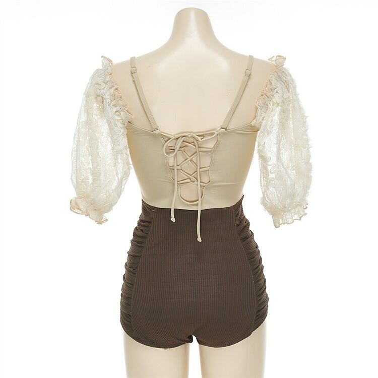 ワンピース水着 一体型 ワイヤーなし 体型カバー水着 パット付き 女性用 オフショルダー 透け感ありレースがセクシー☆ワンピだから隠せる部分が多いのも◎