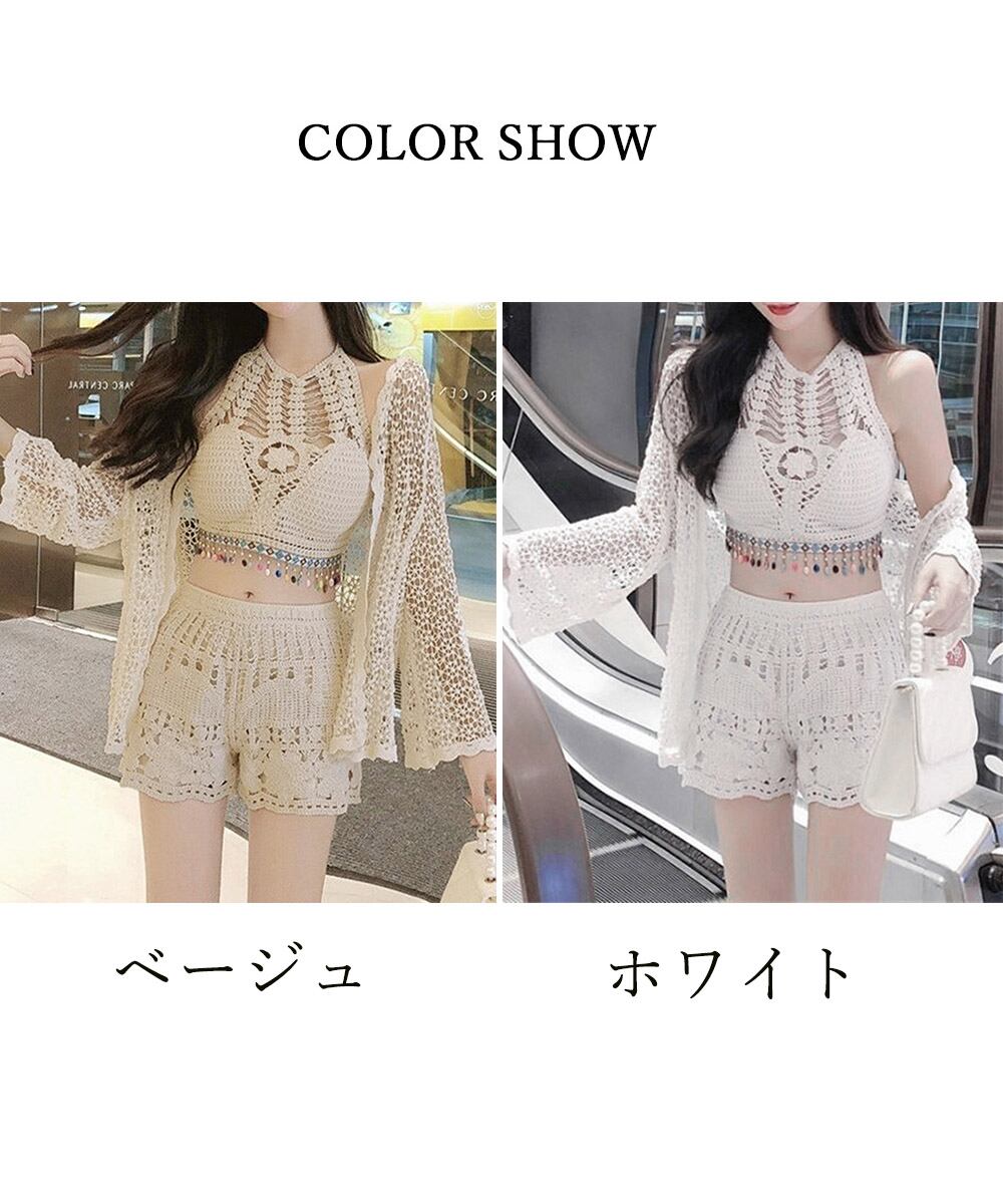 ボヘミアン クロシェ編みニット水着セットホルターネックビスチェ タッセルニット 日焼け防止カーディガン ハイウエスショーツ エスニック風 セクシーセパレート水着