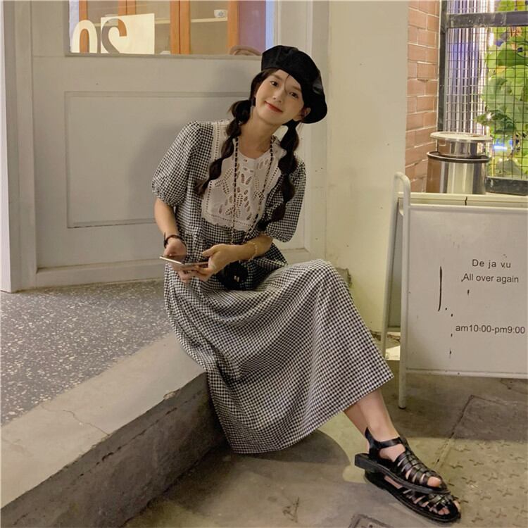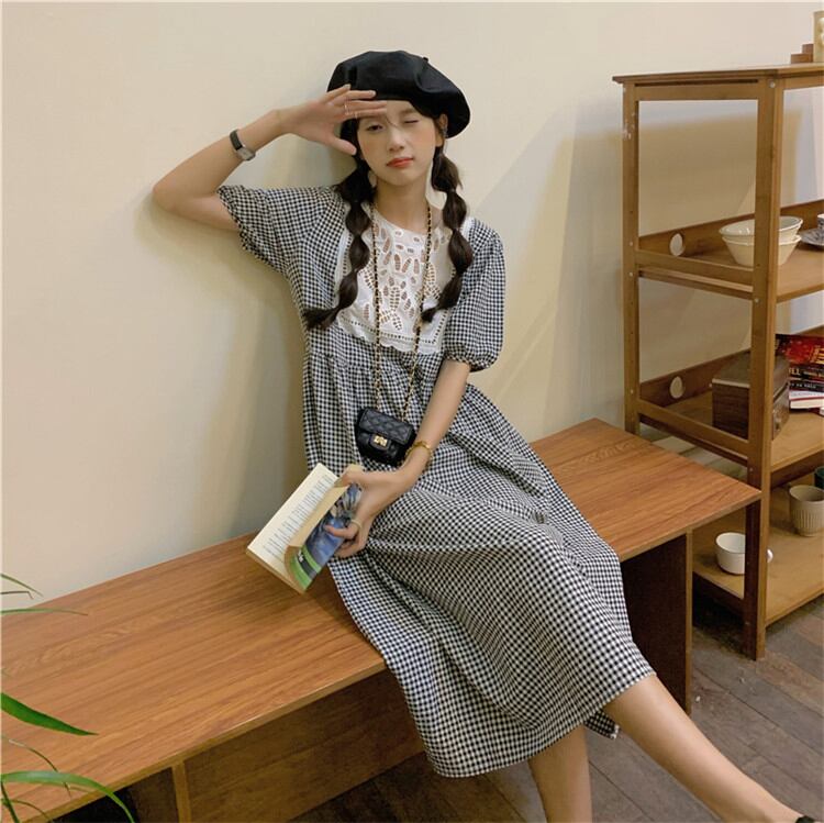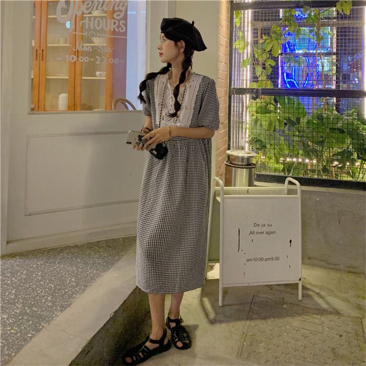レトロ チェック柄 縫付 半袖 レース ゆったりする ワンピース