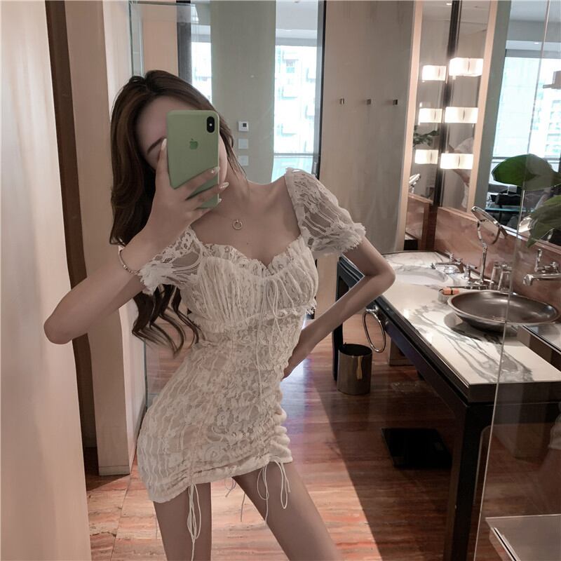 韓国ファッション セクシー レース 半袖 大きなUネック バッグヒップ ワンピース