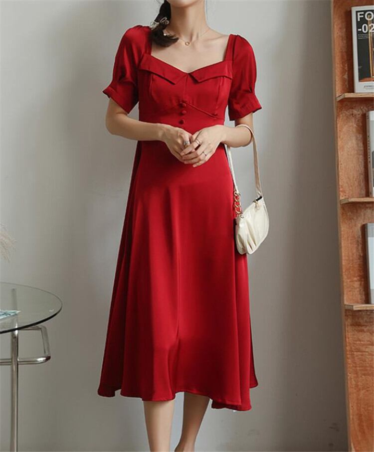 フレンチスタイル ハイエンド 気質 半袖 スクエアネック ワンピース ピュアカラー 夏