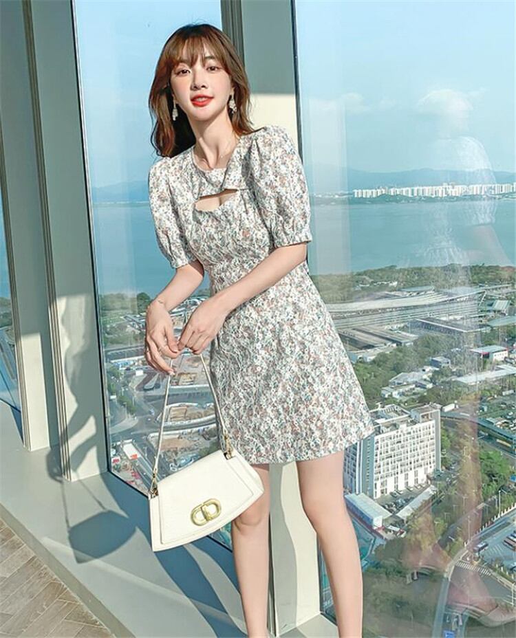 気質 ラウンドネック 透かし彫り 半袖 バンディング スリム 花柄ワンピ sweet系
