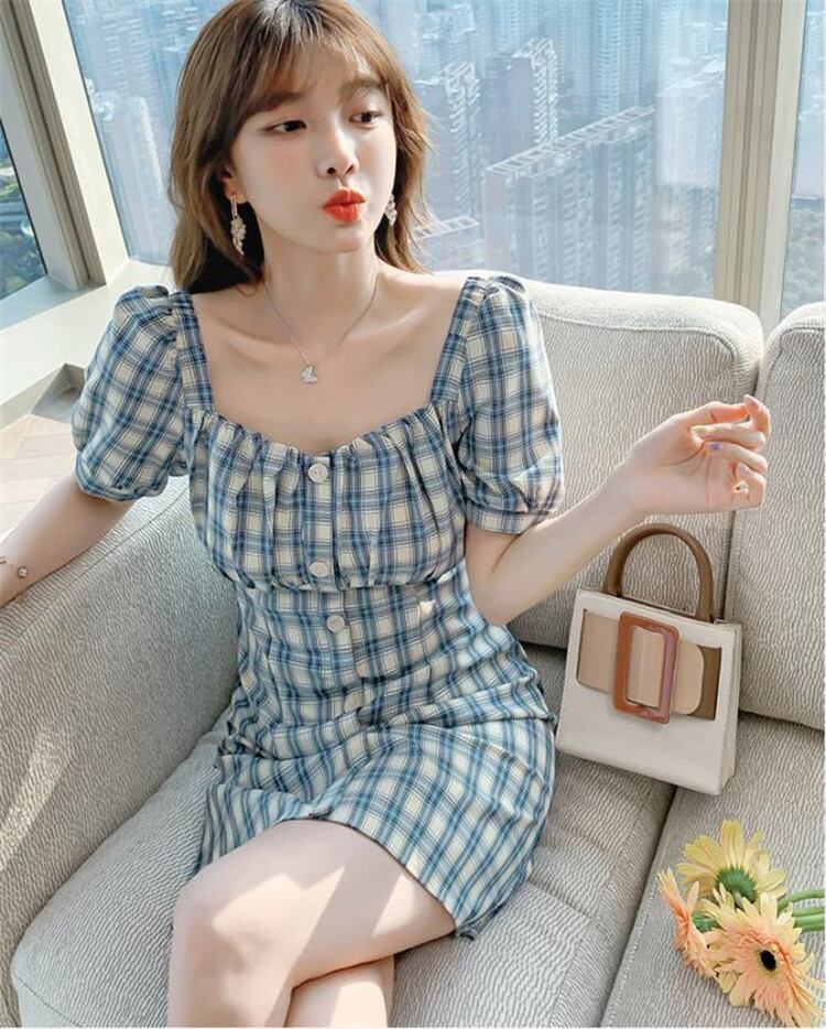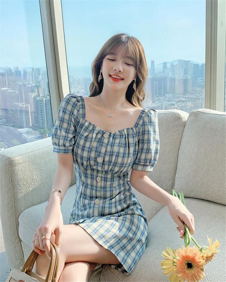 レトロ 格子縞 短いスタイル 女神 スクエアネック 半袖 ワンピース スリム 気質 sweet系
