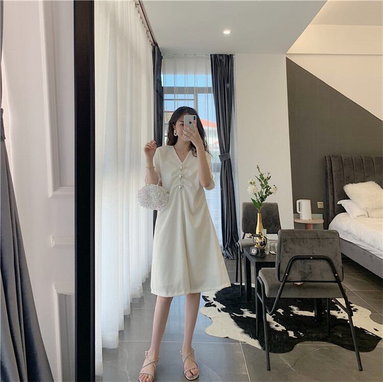 フレンチスタイル トレンド Vネック 真珠 シワ スリム ワンピース 半袖 シンプル