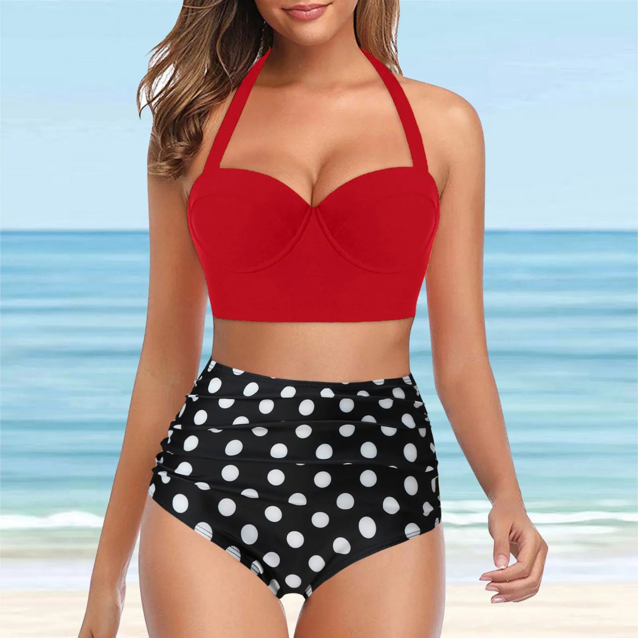 女性用レトロプリントビキニ,水玉水着,ショーツ,腕立て伏せ,ハイウエスト,2022 セパレート水着 ビキニ レディース T240618202829_09